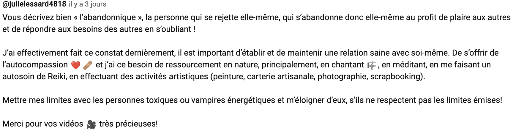 Ensuite, tout le travail que nous nous apprêtons à faire ensemble reprend les 5 blessures énumérées par Lise Bourbeau.