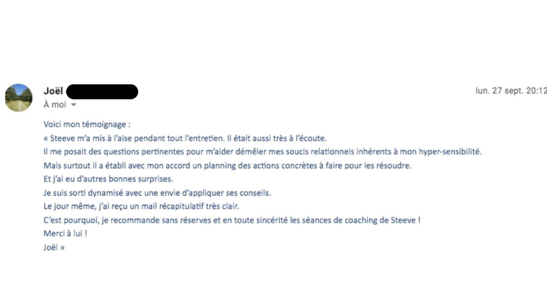 3 appels vidéos de 60 minutes avec Steeve pour travailler en profondeur sur ton plus gros problème en lien avec l'expérience de rejet et mettre en place un plan d'action personnalisé pour le résoudre