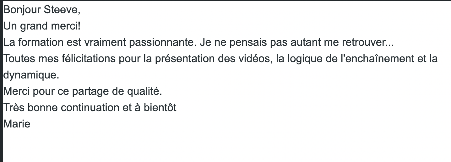 Tu conserveras ton accès à la formation à vie. Tu pourras la suivre et la suivre à nouveau, dès que tu en sentiras le besoin.