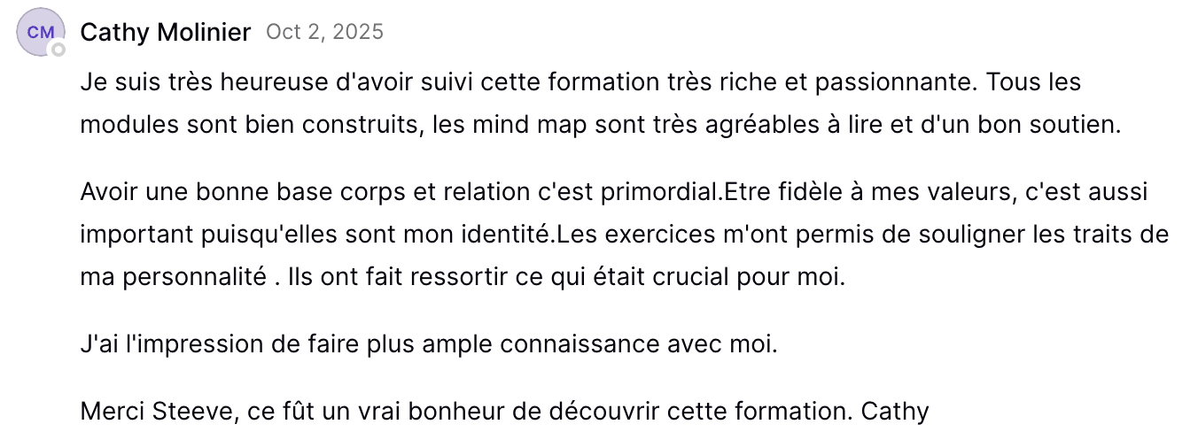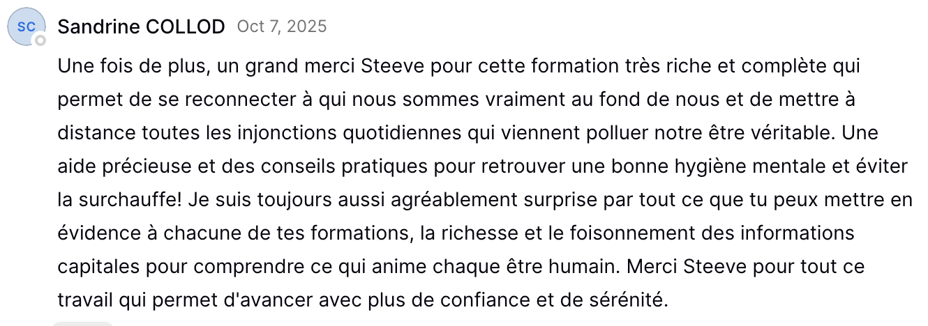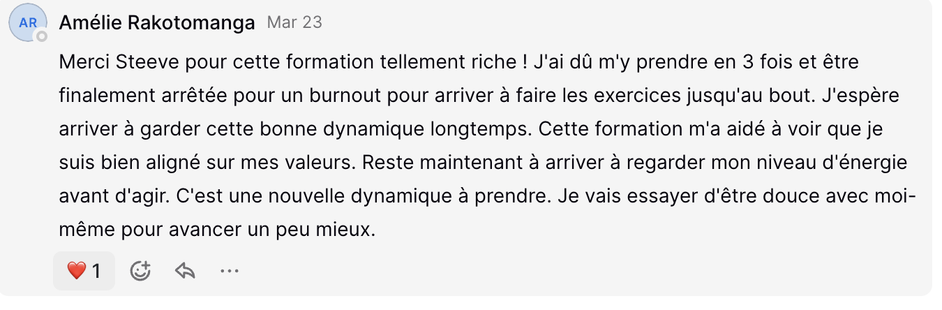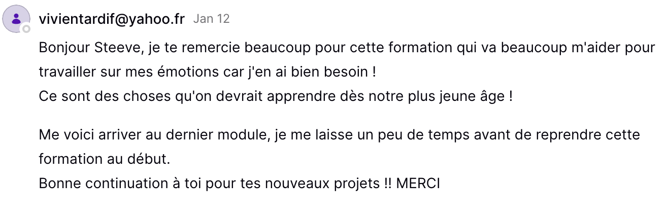 Tu conserveras ton accès aux formations à vie. Tu pourras les suivre à nouveau, dès que tu en sentiras le besoin.